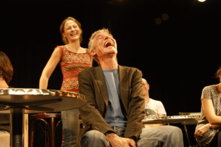 "L’Homme d’onze heure moins le quart est une traversée poétique et décalée dans les méandres de la pensée. C’est l’histoire d’un homme aux prises avec ses voix. Un homme à la frontière. Entre raison et vertige. Entre bar et hôpital. Entre ce qui relie et ce qui isole. Pierrot interroge le monde avec ce qu’il a : ses hallucinations, ses colères, son humour, et une rage douce. Il décrit ce qu’il a traversé. Ce qu’il a vu, entendu, perdu, combattu. Et à travers lui, ce sont nos propres certitudes qui vacillent. Qu’est-ce qu’être normal ? À quoi tient une chute ? Comment revient-on? Et comment est le monde quand on tombe du fil ?" 24 acteurs sur scènes.